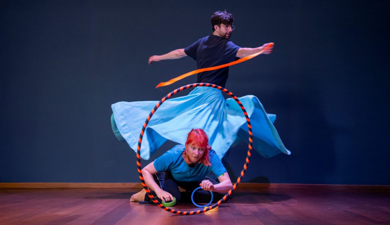 Alles kan draaien in OM en OM en OM. De paraplu, de hoepel, de stoel, de wereld – en jij en ik! Karlijn draait om, Bram draait om en om, Karlijn kan draaien om en om en om. Waar is Bram nou? Een voorstelling voor de allerkleinsten over verdwijnen en verschijnen, over reiken en pakken, over samen zijn – en dan weer even alleen. Wat weg is, komt terug. Wat ver lijkt, komt dichtbij. Soms zie je iets pas als je even omkijkt. En als de laatste draai gedraaid is, mogen de kinderen zelf tollen, dansen en hun eigen draai vinden. Nog een keer?