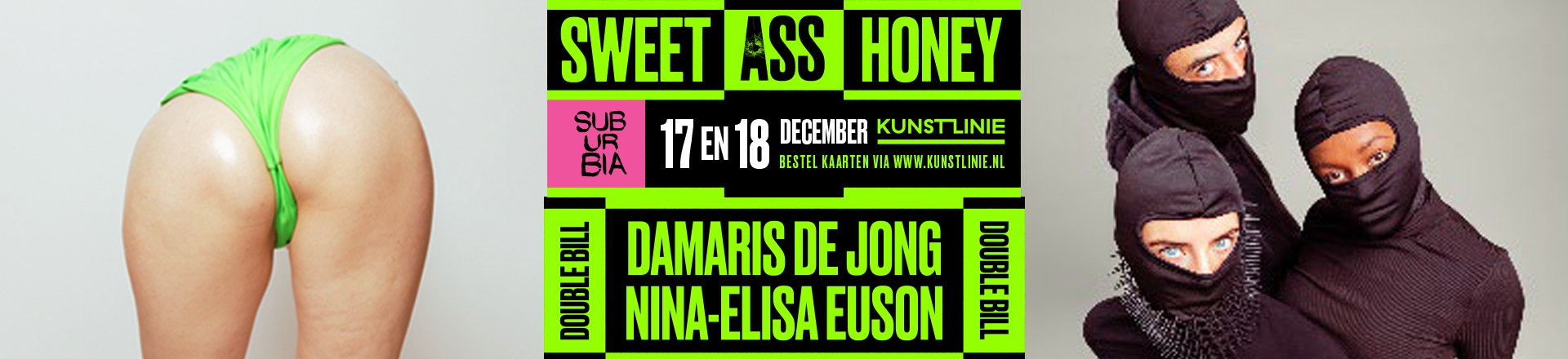 Want, wat betekent het om vrouw te zijn in deze tijd? In een wereld waarin iedereen elkaar bekijkt en beoordeeld, onderzoeken theatermakers Damaris de Jong en Nina-Elisa Euson het vrouw-zijn in al haar lagen. De tweeluik ‘Sweet Ass Honey’ brengt favorieten van Theaterfestival de Parade, ‘KONT’ en ‘Gif & Honing’ samen. Met scherpe humor en indringend muziektheater laten ze zien hoe vrouwen geconfronteerd worden met schoonheidsidealen, met macht en oordeel, en met geweld en woede in hun leven.